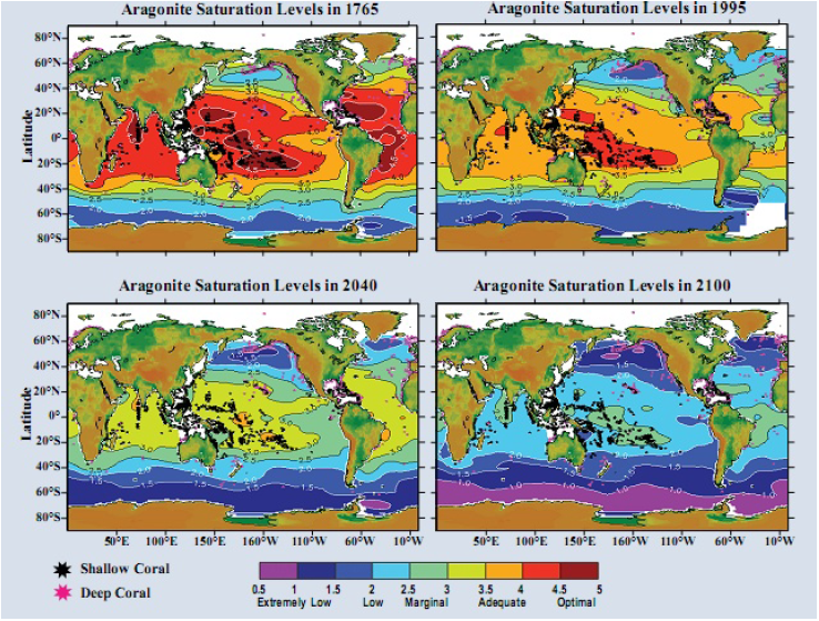 Figure 3 Simulated aragonite saturation states of the surface ocean: past, present, and future.