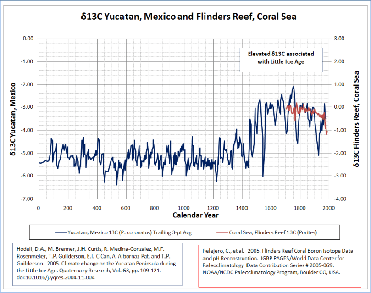 The red curve in Figure 5 is the Flinders Reef δ13C that was cited as “Human Fingerprint #1” in Skeptical Science’s The Scientific Guide to Global Warming Skepticism. The rate of δ13C depletion is quite similar to that of the lacustrine deposit on the Yucatan. The Flinders Reef data do not extend back before the Little Ice Age; so there is no way to tell if the modern depletion is an anomaly, if the δ13C was anomalously elevated during the 18th and 19th centuries and the depletion is simply a return to the norm or if δ13C is cyclical.