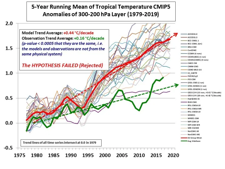 Figure 1. CMIP5 models versus weather balloon observations in green. The details of why the models fail statistically can be seen in a 2018 paper by McKitrick and Christy here.