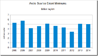 In the last two years, Arctic sea ice extent in September has seen a strong recovery from the 2012 record low, and is close to 2005 levels.