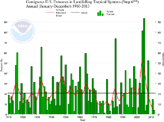 from 1992 to 2013, not counting hurricanes, based on 10-