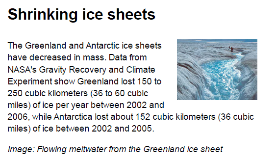 NASA says “Greenland lost 150 to 250 cubic kilometers (36 to 60 cubic miles) of ice per year” But they forgot to mention Greenland has 2,850,000 cubic kilometers of ice. That means that, at the stated rate, it will take 45,600 years (three times the length of time since the last ice age) to melt!  https://en.wikipedia.org/wiki/Greenland_ice_sheet