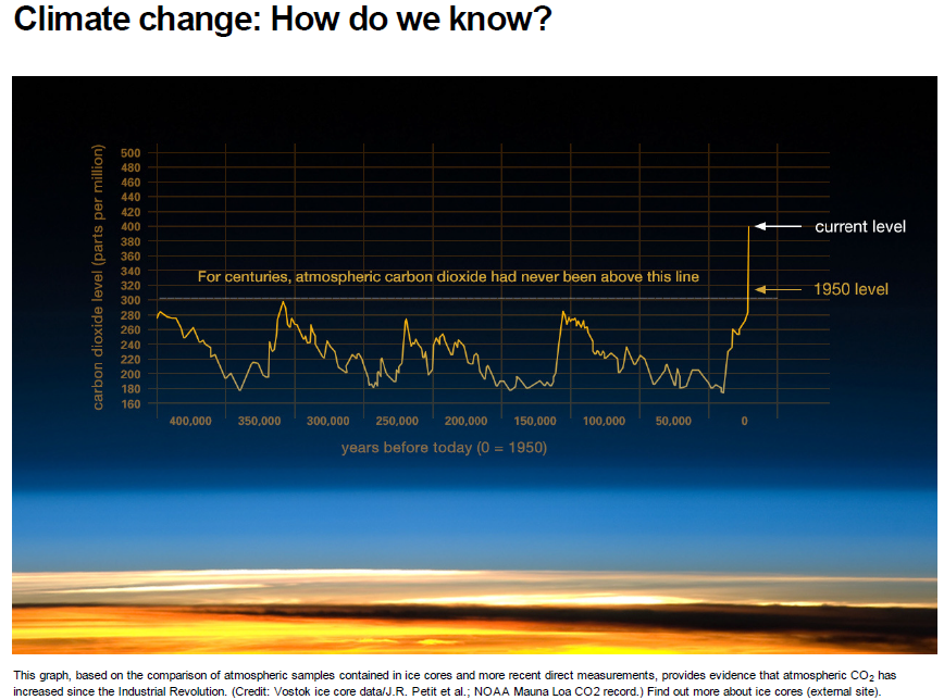 The NASA page, https://climate.nasa.gov/evidence/, starts with a picture showing current CO2 readings spliced to historical data. This is splicing of data is almost universally condemned as two datasets are usually not comparable. For instance, the current readings resolve daily CO2 levels ans show short peaks, while the ice core data cannot resolve anything less than several hundred years which hides any short term excursions such as today’s levels may be. Further there is controversy as to how accurate the CO2 level measurements are from ice cores.