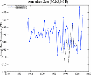 Addendum, August 24, 2006: "Ozone hole stable, say scientists" - "Leading scientists in the United States say the hole in the ozone layer of the Earth's atmosphere above the Antarctic appears to have stopped widening." (BBC) What's "normal" for the region? No one knows. Do these represent some sort of phase shift in Antarctica? We don't know. Nor do we know if one event caused the other but a step shift in apparent mean stratospheric ozone is a very peculiar result from a gradual accumulation of CFCs, no? See Here for the complete article