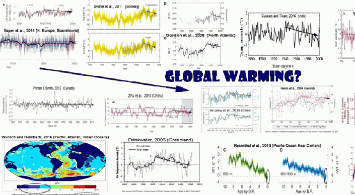 That is, when scientists reconstruct sea surface temperatures (SST) and land surface temperatures and deep ocean heat content from the paleoclimate record (hundreds to thousands of years ago) using existing physical proxy evidence, and when they use this same physical evidence to reconstruct the modern temperatures, the rapid and dangerous warming trend that mysteriously forms a hockey stick shape for recent decades seems to just simply . . . disappear. In its place is a modern record of temperatures from locations all over the world that looks like anything but a rapidly warming, dangerous, and unprecedented hockey stick. Instead, the paleoclimate record reveals the opposite: large regions of the Earth were significantly warmer than they are now for most of the last several thousand years.