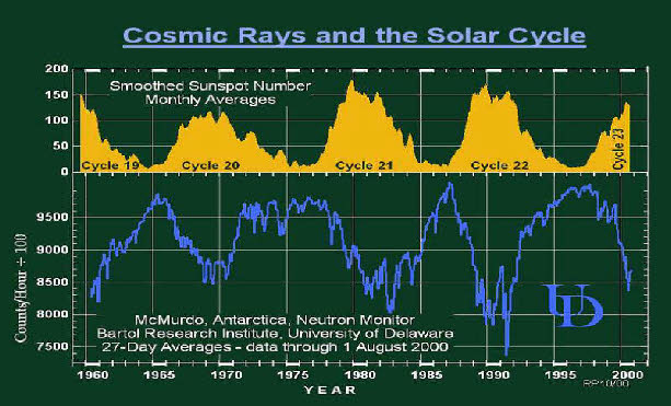 There is a close relationship between the number of sunspots and cosmic rays.