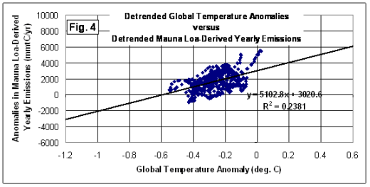 Both are on the increase, an empirical observation that is qualitatively consistent with the “consensus” view that increasing anthropogenic CO2 emissions are causing the warming. Note also that they both have a “bend” in them that looks similar, which might also lead one to speculate that there is a physical connection between them.