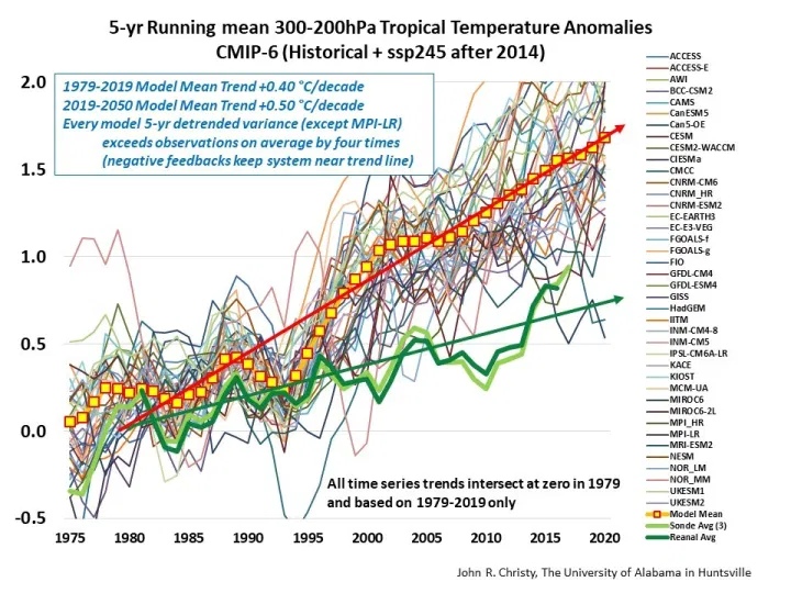 On January 22, 2021, John Christy presented a new online talk to the Irish Climate Science Forum. The talk was arranged by Jim O’Brien. A summary of the presentation can be read at clintel.org here. In this post we present two interesting graphs from the presentation. These compare observations to the IPCC Coupled Model Intercomparison Project 5 climate models (CMIP5, 2013) and CMIP6 (current set of IPCC models) climate model projections.
