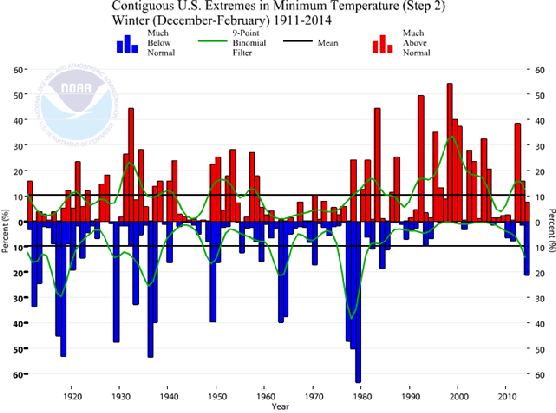 The index he refers to, of course, is the one that counts a mild winter as extreme. It is the same index which regards 1936 as one of the least extreme years, although it had the 2nd coldest winter on record, and the hottest summer. NOAA’s system is so sophisticated that it averages the two together to make the year average!