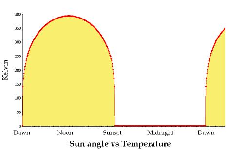 As you see, with the first glimpse of sunlight as lunar day commences, the blackbody’s surface temperature rises and keeps rising till solar noon, after which the temperature decline mirrors the rise. Having emitted 100% of its thermal energy at every step, however, this imaginary surface has nothing in reserve to last the night, meaning that a rotating blackbody surface theoretically remains at absolute zero for half of the time.