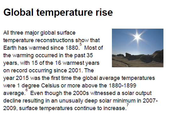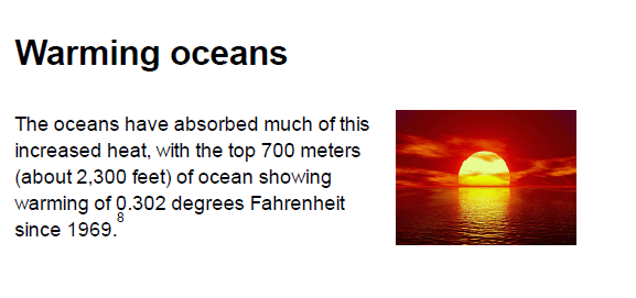 *  They also mention ocean warming, but do it in degrees Farenheit, instead of the usual degrees Centagrade. This makes the warming seem bigger. The actual warming they claim is ONE THIRD of a degree Centigrade per century, a trivial amount.