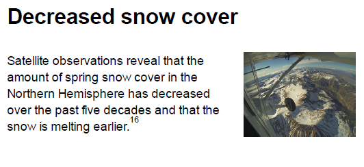 NASA claims “Satellite observations reveal that the amount of spring snow cover in the Northern Hemisphere has decreased over the past five decades and that the snow is melting earlier” but neglects to admit that we have virtually no data before satellites, so we really don’t know if this is unusual.