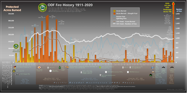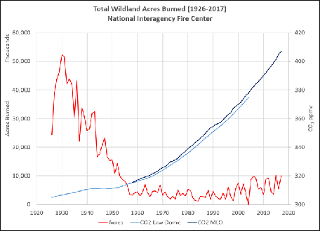 Note the dramatic fall in number of fires since 1939. The consistent low number of fires as CO2 increased shows that CO2 is NOT the cause of the 2020 outlier increase in fires since there is no increase in fires as CO2 slowly rose.